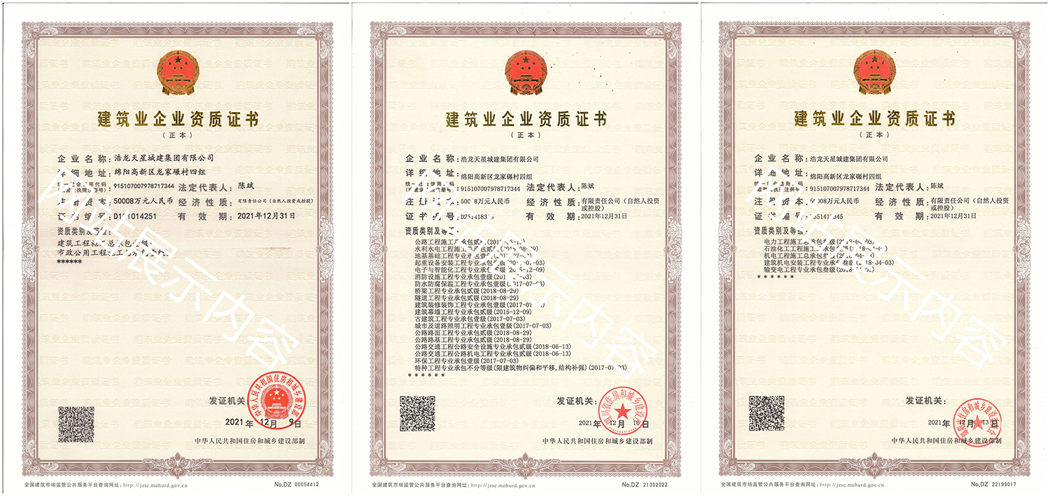 浩龍?zhí)煨浅墙瘓F(tuán)有限公司,2007年成立于“李白故鄉(xiāng)、中國(guó)科技城”—四川省綿陽(yáng)市,企業(yè)注冊(cè)資本金5.0008億元。公司共有27項(xiàng)建筑業(yè)企業(yè)資質(zhì),其中國(guó)家一級(jí)資質(zhì)11項(xiàng),二級(jí)資質(zhì)10項(xiàng),三級(jí)資質(zhì)5項(xiàng),特種資質(zhì)不分等級(jí)1項(xiàng),類(lèi)別涵蓋建筑、市政、水利、機(jī)電、隧道、起重設(shè)備安裝等基礎(chǔ)及未來(lái)發(fā)展重點(diǎn)專(zhuān)業(yè)。公司...